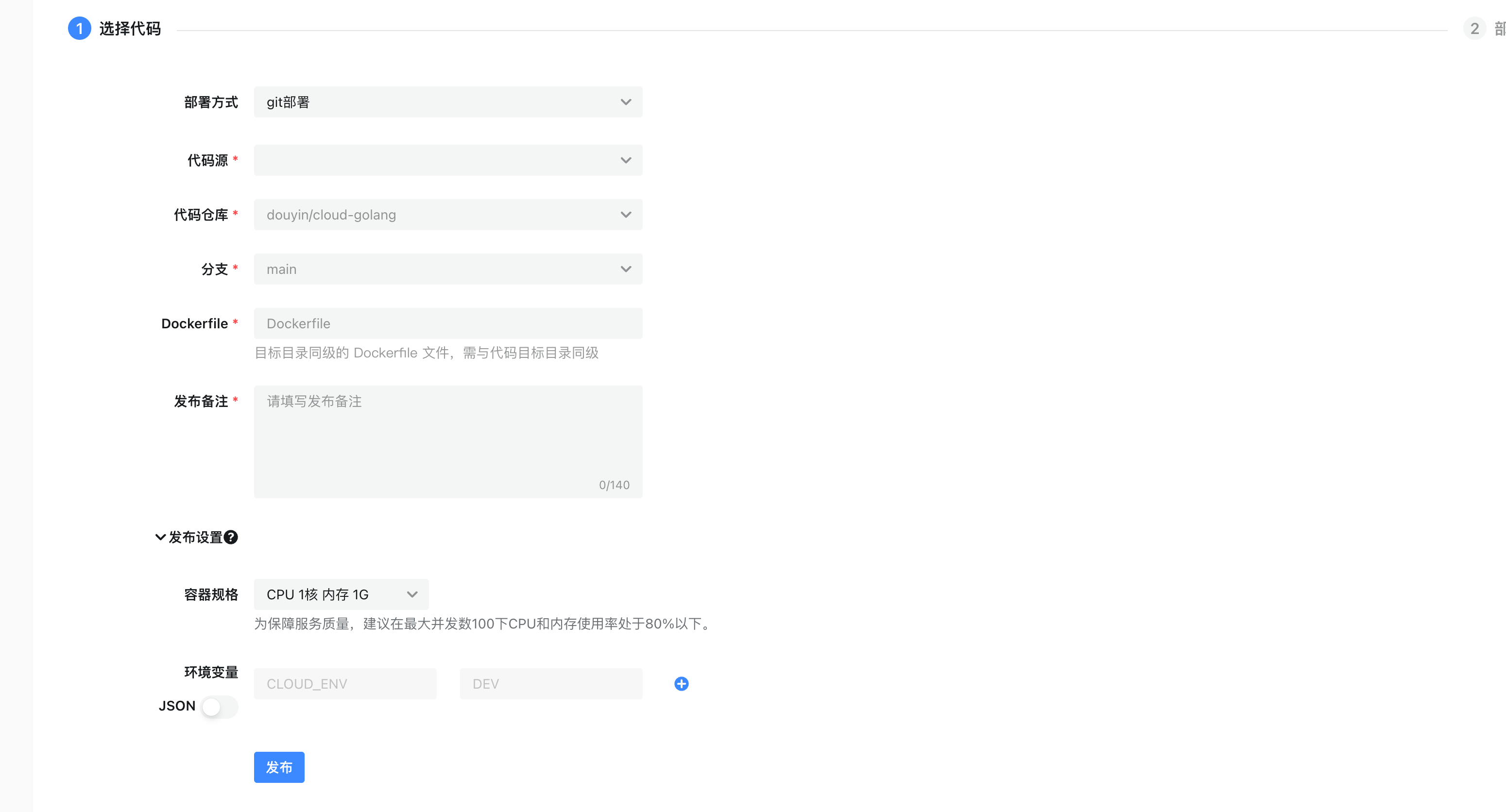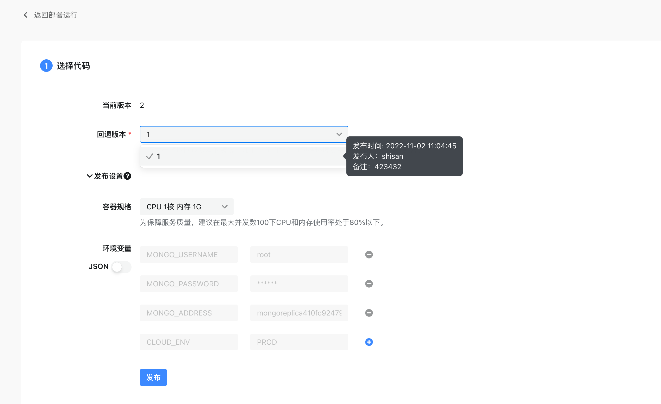 可以选择部署方式,以及填写此次发布需要的环境变量和容器的规格。确定后点击【发布】。